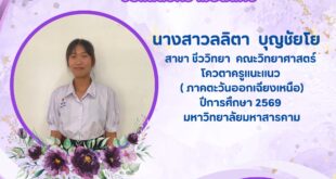 นางสาวลลิตา บุญชัยโย นักเรียนคนเก่งของเรา ที่สอบติด สาขา ชีววิทยา คณะวิทยาศาสตร์ โควตาครูแนะนำ (ภาคตะวันออกเฉียงเหนือ) ปีการศึกษา 2569 มหาวิทยาลัยมหาสารคาม