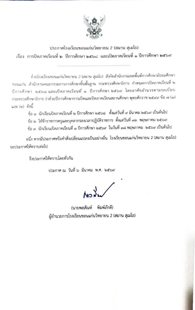 โรงเรียนขอนแก่นวิทยายน 2 (สมาน สุเมโธ) ขอแจ้งกำหนดการเปิดภาคเรียนที่ 1 ปีการศึกษา 2569 โดยภายหลังจากสิ้นสุดการจัดการเรียนการสอนในภาคเรียนที่ผ่านมา นักเรียนจะเข้าสู่ช่วงปิดภาคเรียนเพื่อพักผ่อนและเตรียมความพร้อมสำหรับการศึกษาในภาคเรียนถัดไป