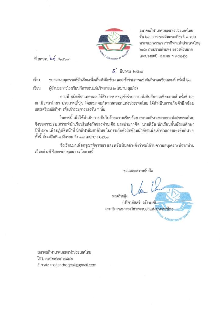 ทั้งนี้ มีกำหนดเข้าร่วมการเก็บตัวฝึกซ้อมระหว่างวันที่ 8 มีนาคม ถึง 17 เมษายน 2569 ซึ่งนับเป็นความสำเร็จที่สะท้อนถึงศักยภาพ ความมุ่งมั่น และความสามารถของนักเรียน ตลอดจนการสนับสนุนจากคณะครูและผู้ฝึกสอน โรงเรียนขออวยพรให้ประสบความสำเร็จและสร้างชื่อเสียงให้กับประเทศชาติต่อไป.