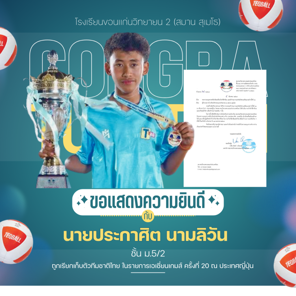 โรงเรียนขอนแก่นวิทยายน 2 (สมาน สุเมโธ) ขอแสดงความยินดีกับ นายประกาศิต นามลิวัน นักเรียนชั้นมัธยมศึกษาปีที่ 5/2 ที่ได้รับการเรียกเก็บตัวเป็นนักกีฬาทีมชาติไทย เพื่อเตรียมความพร้อมเข้าร่วมการแข่งขัน เอเชียนเกมส์ ครั้งที่ 20 ณ ประเทศญี่ปุ่น