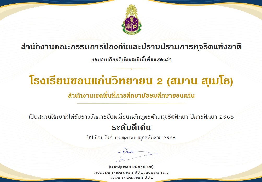 ได้รับรางวัล 🏆 สถานศึกษาขับเคลื่อนหลักสูตรด้านการป้องกันการทุจริตศึกษา “ระดับดีเด่น”